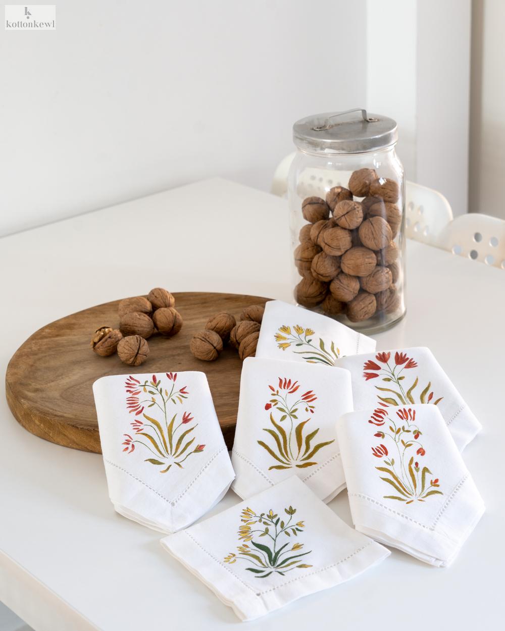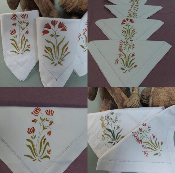 CARACTERÍSTICAS: Colección Benares, con motivos florales. Individuales 100% algodón, confeccionados y pintados a mano. Se pueden lavar en lavadora